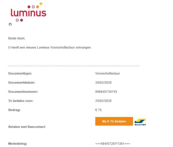 موقع أخبار بلجيكا الآن _ حذرت اليوم شركة الطاقة والكهرباء البلجيكية لومينوس من رسالة بريد إلكتروني مزيفة تطلب من العملاء دفع فاتورة بقيمة 75 يورو. ويبدو أن البريد المرسل احترافي وحقيقي ولكنه ليس كذلك. وقال متحدث باسم شركة لومينوس ، أصبح المحتالون أكثر إبداعًا في بلجيكا.